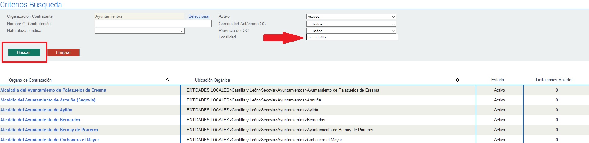 En el formulario de búsqueda de Perfil del Contratante, en el campo Localidad escribir La Lastrilla tal y como muestra la imagen adjunta (click para aumentar), seguido de click en el botón Buscar